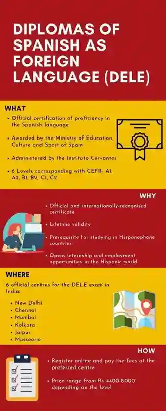 The Spanish Language Proficiency Exam (DELE) follows guidelines of CEFRL (Common European Framework of Reference for Language) and is conducted by Instituto Cervantes on behalf of the Spanish Ministry of Education and Science in India. The DELE (Diplomas de Español como Lengua Extranjera (Diplomas of Spanish as Foreign Language)) certificate is accepted and acknowledged by public and private educational institutions, governments, and companies all around the world. For more details please check following links